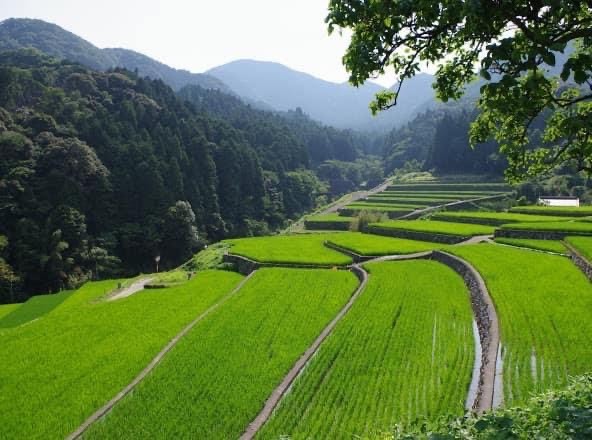 新緑が美しい田植え後の竹棚田(400年の歴史を持つ400畳の棚田)