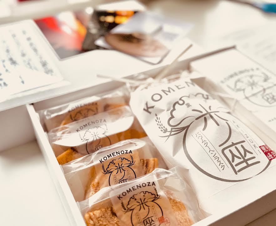 「米ノ座」のバウムクーヘンは、東峰村産「棚田米」と朝倉産ブランド米「君不知(きみしらず)」の2 種の米粉を使用するグルテンフリーのバウムクーヘンです。